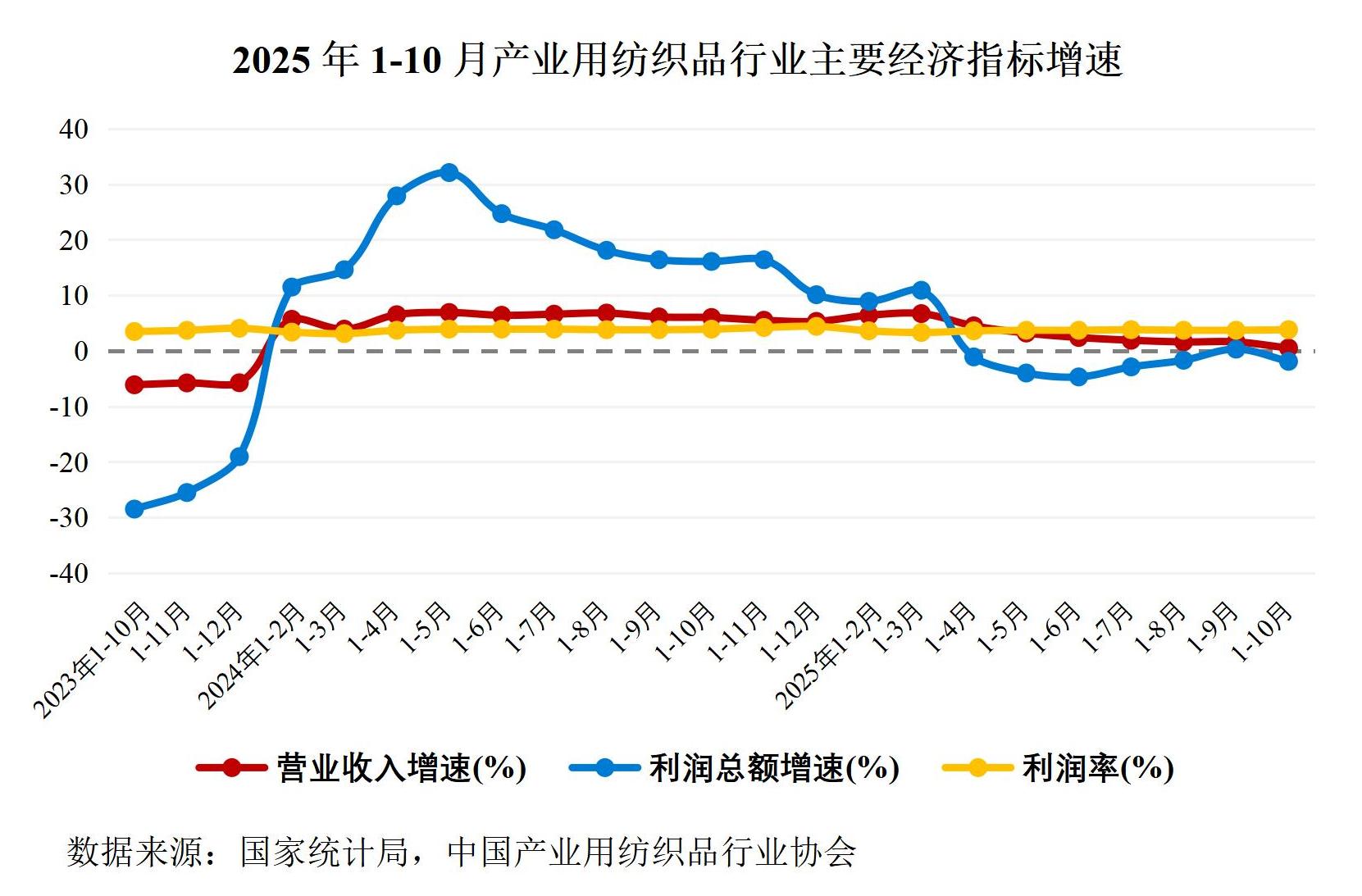 2025年1-10月,世界经济在不确定性中呈现温和放缓趋势,政策不确定性加剧、保护主义抬头等因素仍是导致增速放缓的主要因素;国内经济运行总体平稳,稳中有进态势持续,转型升级扎实推进,发展新动能继续壮大;我国产业用纺织品行业的生产与销售基本保持平稳,行业盈利能力整体承压,出口增速有所放缓。
