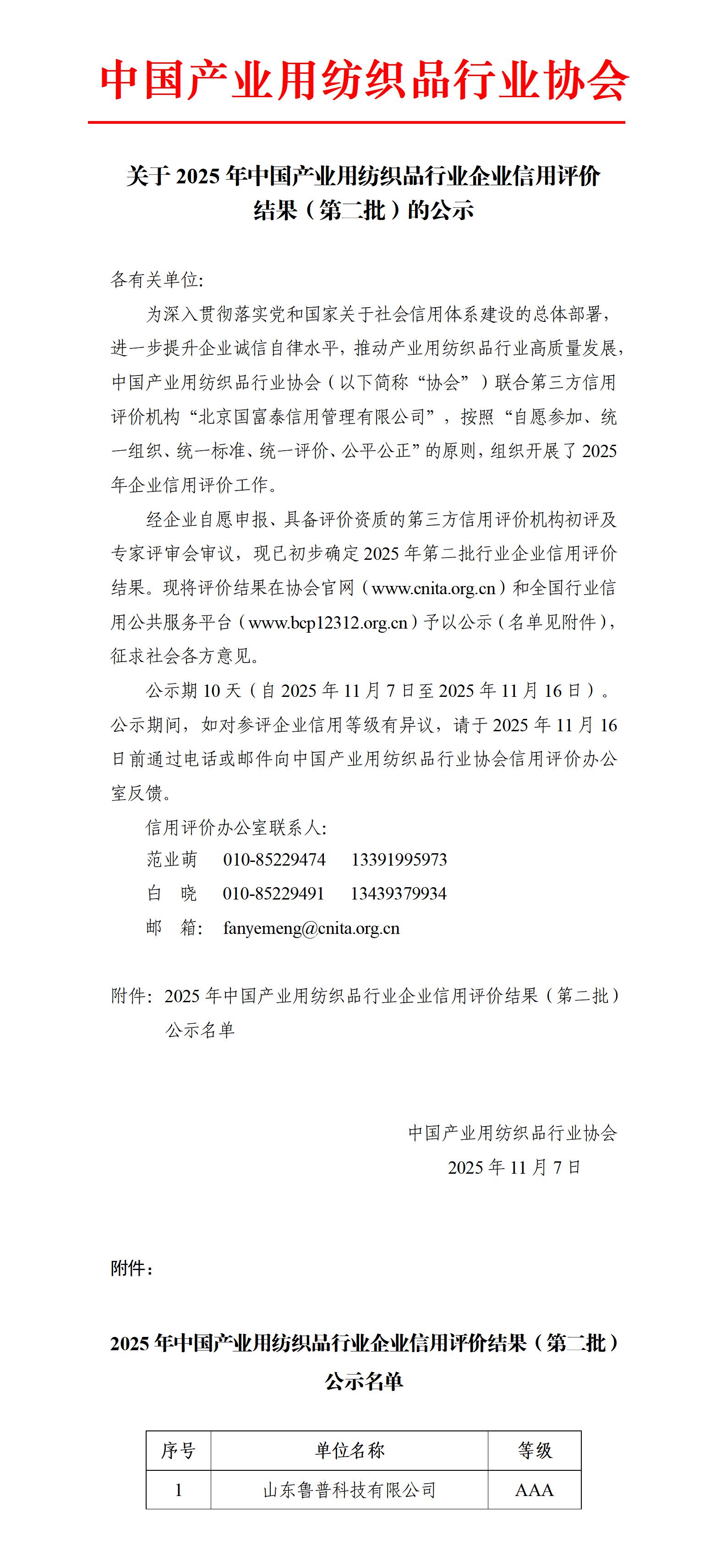 关于2025年中国产业用纺织品行业企业信用评价结果(第二批)的公示