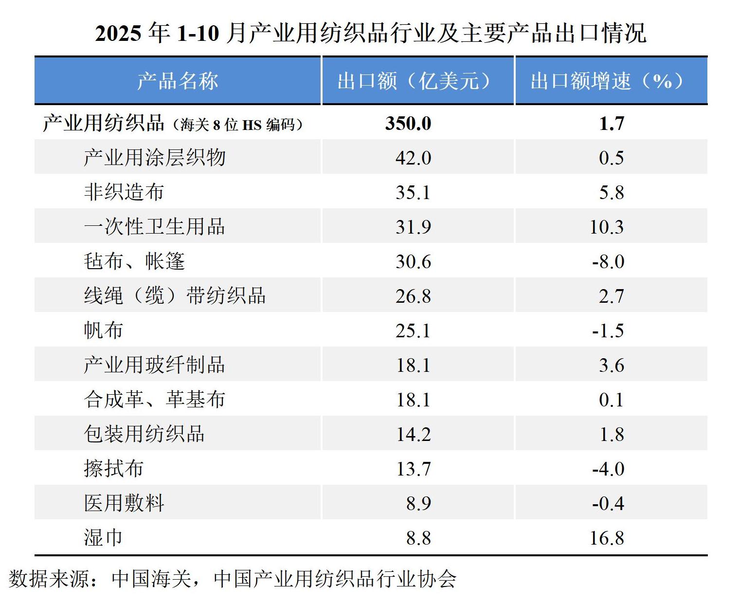 国际贸易方面,根据中国海关数据(海关8位HS编码统计数据),2025年1-10月我国产业用纺织品行业的出口额为350亿美元,同比增长1.7%;行业进口额为45.5亿美元,同比增长4.3%。