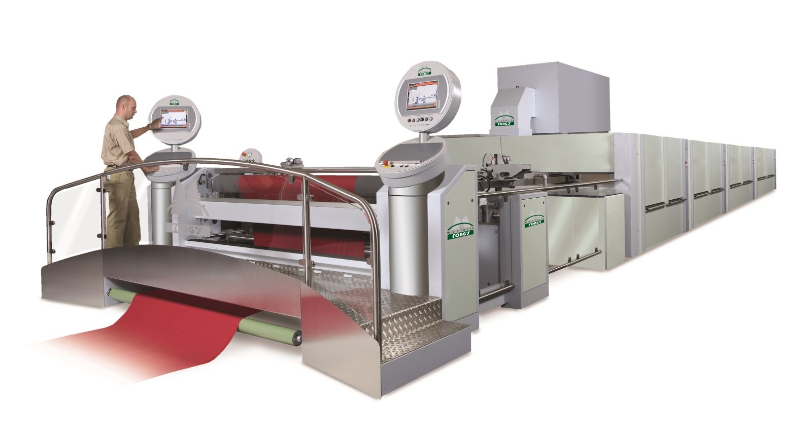 在整条生产线上采用智能化,数字化精准控制各参数以期达到生产效果。Montex 6000型轧车可适应不同品种的需要。德国制造的Montex®Coat多功能版本涂层机创新性地将刮刀涂层,磁辊涂层和圆网印花三种涂层模式集合为一体,可适用从1000mpas到35000mpas范围的浆料粘度,广泛应用于不同布种,所有操作和显示可通过数字化操控触摸屏来实现,可一键切换不同功能的涂层模式。该涂层机同时装配有2把不同形状的刮刀,分别适用于不同的厚度和渗透性的涂层。根据工艺需求可选择铝制,钢制或碳纤维的涂层辊,涂层精度可高达0.02-0.1mm。磁辊涂层是门富士独有的涂层方式,可选择不同的加工方式,广泛应用于特殊布种的涂层,且适用于粘度较低的水状浆料。圆网印花可选择磁力模式或非磁力模式,可应用于各种花型的印花,双面作用的涂层和3D点状防火面料涂层。轻薄型非织造布可以用圆网印花的方式加工,浆料的渗透度低,产品的手感和悬垂性较好。AFD(Air Filtration Device)一体化废气热回收装置由静电过滤单元,热交换器单元和自动清洗水箱组成,不仅可以高效的分离、过滤和净化涂层定型时产生的废气混合物,并且将烘箱中排风的余热进行回收再利用,实现高效率低能耗。