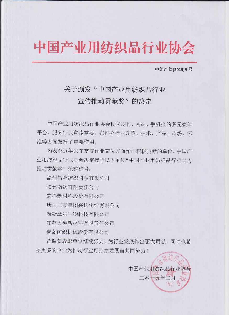 为表彰近年来在支持行业宣传方面作出积极贡献的单位,中国产业用纺织品行业协会决定授予以下单位“中国产业用纺织品行业宣传推动贡献奖”荣誉称号: