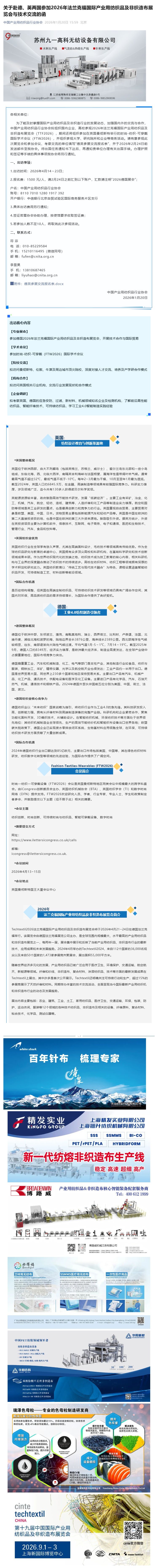 关于赴德、英两国参加2026年法兰克福国际产业用纺织品及非织造布展览会与技术交流的函