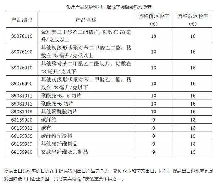 本次调整涉及部分化纤产品及原料出口退税率提高,详见下表: