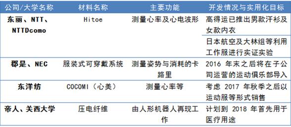 各公司此前针对体育运动、医疗用途先后开发出了智能服装,最近此类产品的用途也开始向其他领域扩大。东丽与中国大型纤维企业青岛即发集团展开了合作。2016年下半年将在即发集团新设的养老院中,启动让入住老人穿上嵌有hitoe的衣服来管理身体情况的实证实验。东洋纺也打算将COCOMI的用途扩大到工作服及医疗领域。