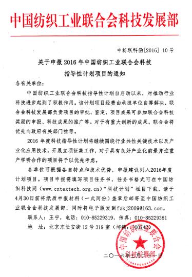 目前,中国纺织工业联合会已启动2016年科技指导性项目申报工作。中纺联科技指导性计划项目经费由承担单位自筹解决,联合会科技发展部负责组织项目的审批和鉴定,通过鉴定的项目成果可作为部级成果参加联合会科技奖励的申报等。对获得纺织工业联合会科学技术一等奖、二等奖的项目,将择优推荐参加国家科学技术奖的评审。